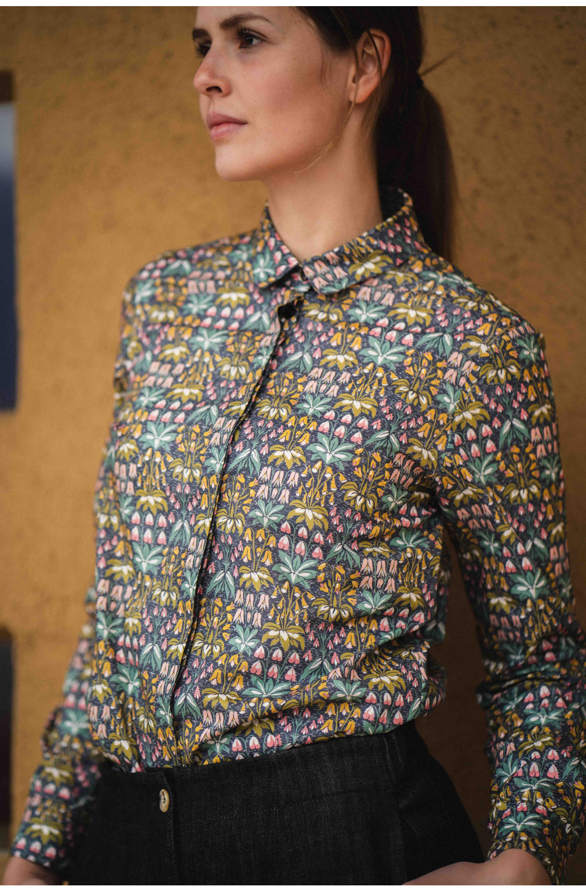 Unser Credo? Wir verarbeiten die besten Stoffe und bemühen uns um besondere Schnitte. Für diese Bluse haben wir uns für einen wunderbaren Liberty of London Blumen Stoff entschieden, hergestellt und verarbeitet in Norditalien. Und ganz nebenbei erwähnt – sie lässt sich ganz einfach und wunderbar bügeln.