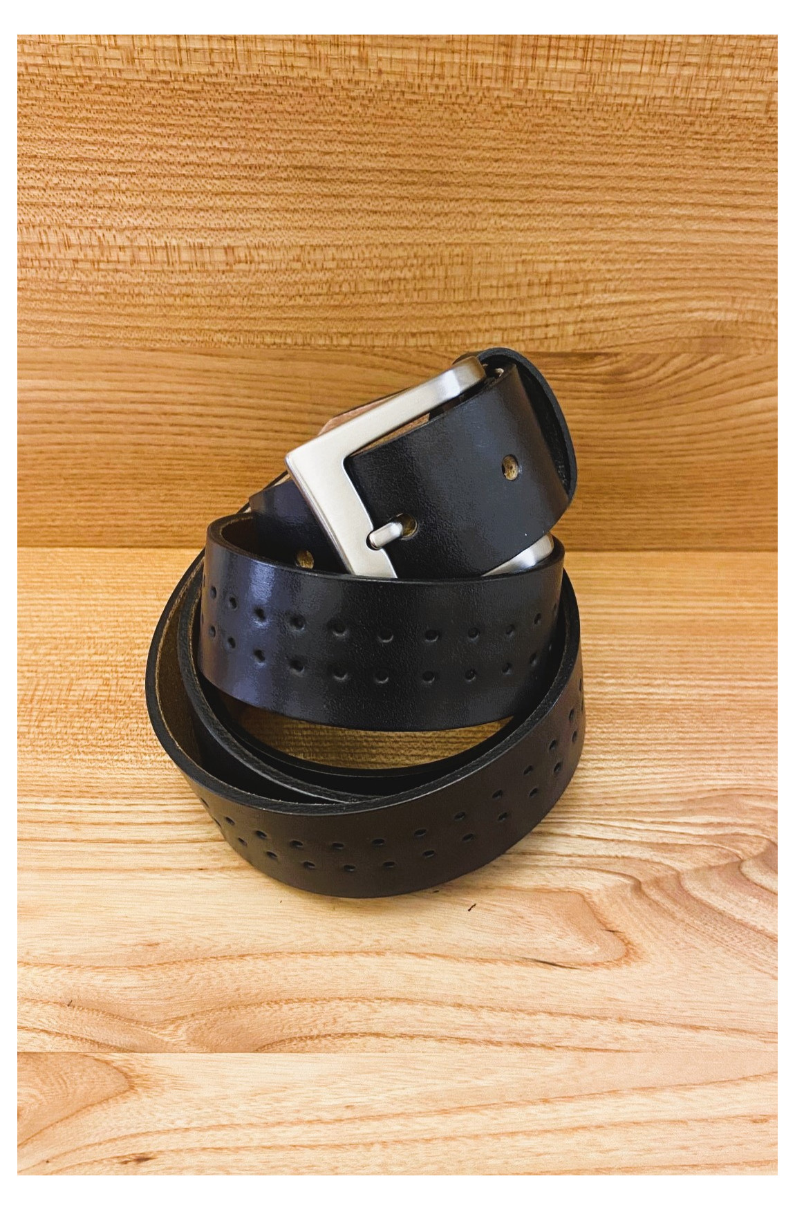 Black leather belt, handmade. The belt is 3.5 cm wide and fits both men and women. The maximum length of 140 cm can be shortened to size; please contact us for this.