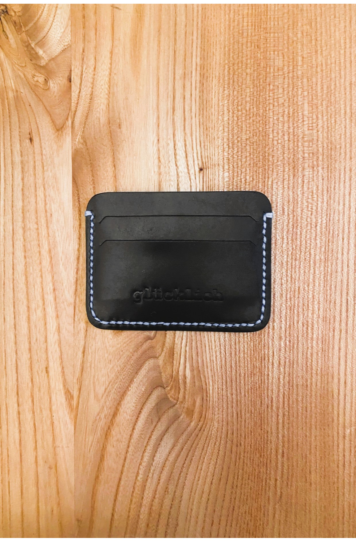 Black cardholder made from the finest Italian leather with cornflower blue stitching and interior lining. It has space for four cards, two on each side, and a central compartment for banknotes.