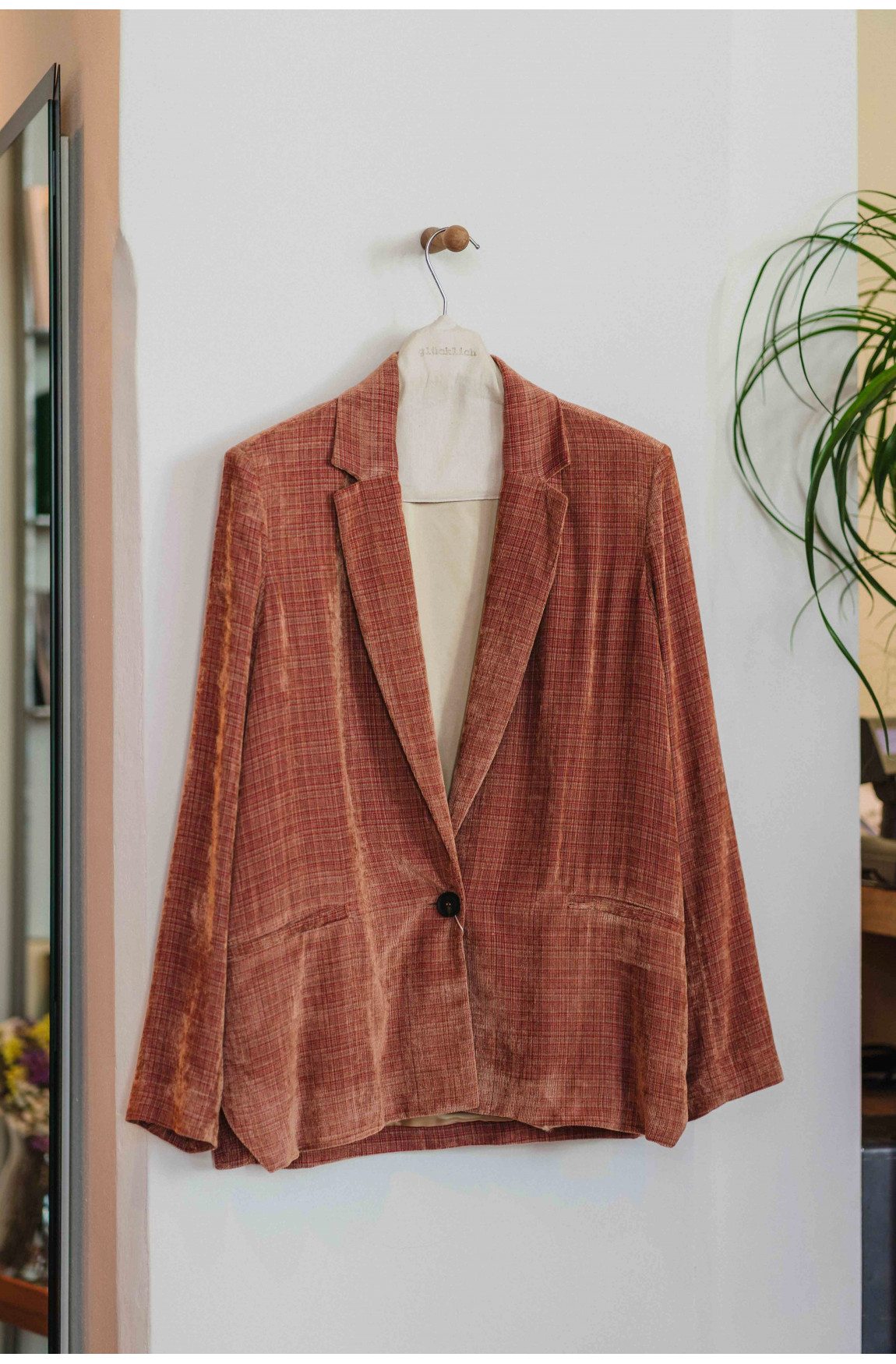 Lightweight blazer jacket with an oversized cut, made from soft baby cord velvet. The jacket also has a side opening.